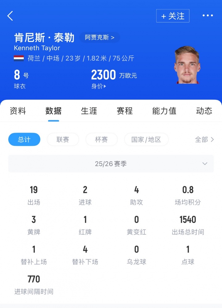 泰勒现年23岁,荷兰籍中场,本赛季代表阿贾克斯各赛事出场19次,贡献2球4助,目前泰勒德转身价为2300万欧元。